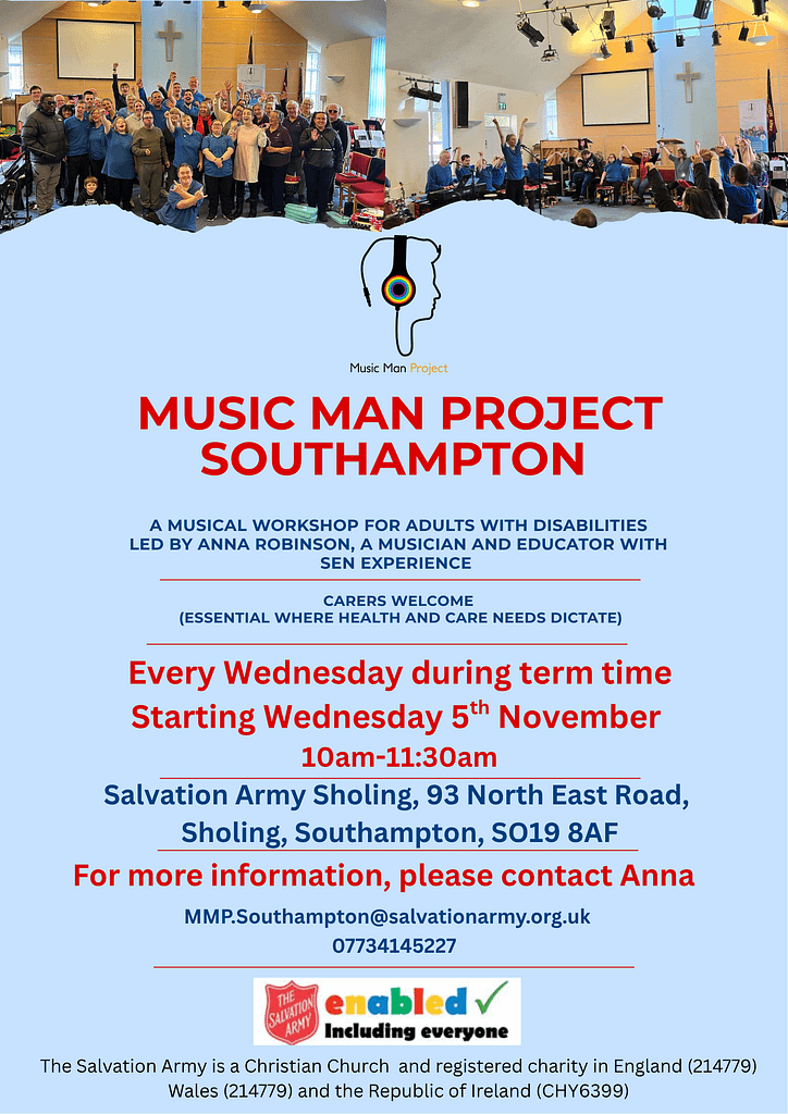 We are the Southampton regional teaching centre for The Music Man Project. Our Regional Director is Anna Robinson, a musician and educator in Southampton with SEN experience, including running an open orchestra. Classes are held at the Salvation Army Southampton Sholing and other session in and around Southampton will follow.